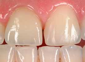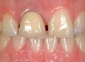 Durch Bleichen der Wurzel des Zahnes und mit einer Vollkeramikkrone konnte die Farbe des Zahnfleischs verbessert werden. Der abgebrochene Zahn wurde mit einem hochwertigen Kunststoff wieder hergestellt. Selbst bei dieser riesigen Vergrößerung ist kein Unterschied zwischen der Krone und dem eigenen Zahn feststellbar.