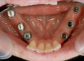 Auf sechs Implantaten mit jeweils zwei festsitzenden Brücken rechts und links konnten alle Zähne ersetzt werden.